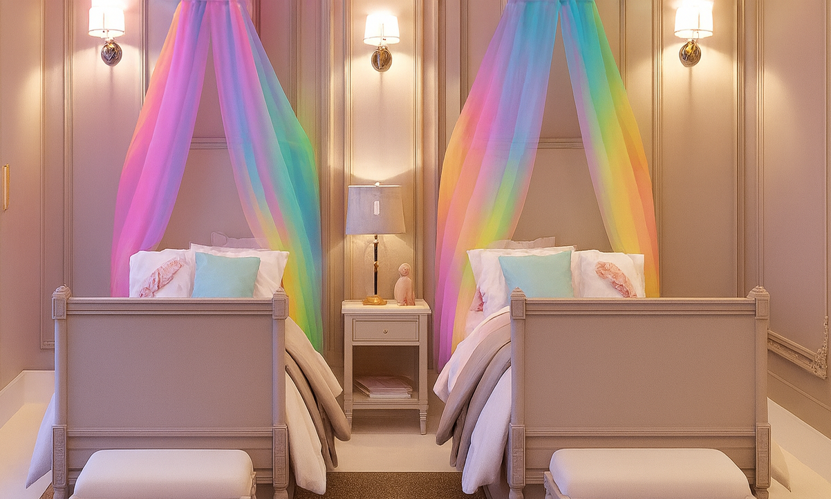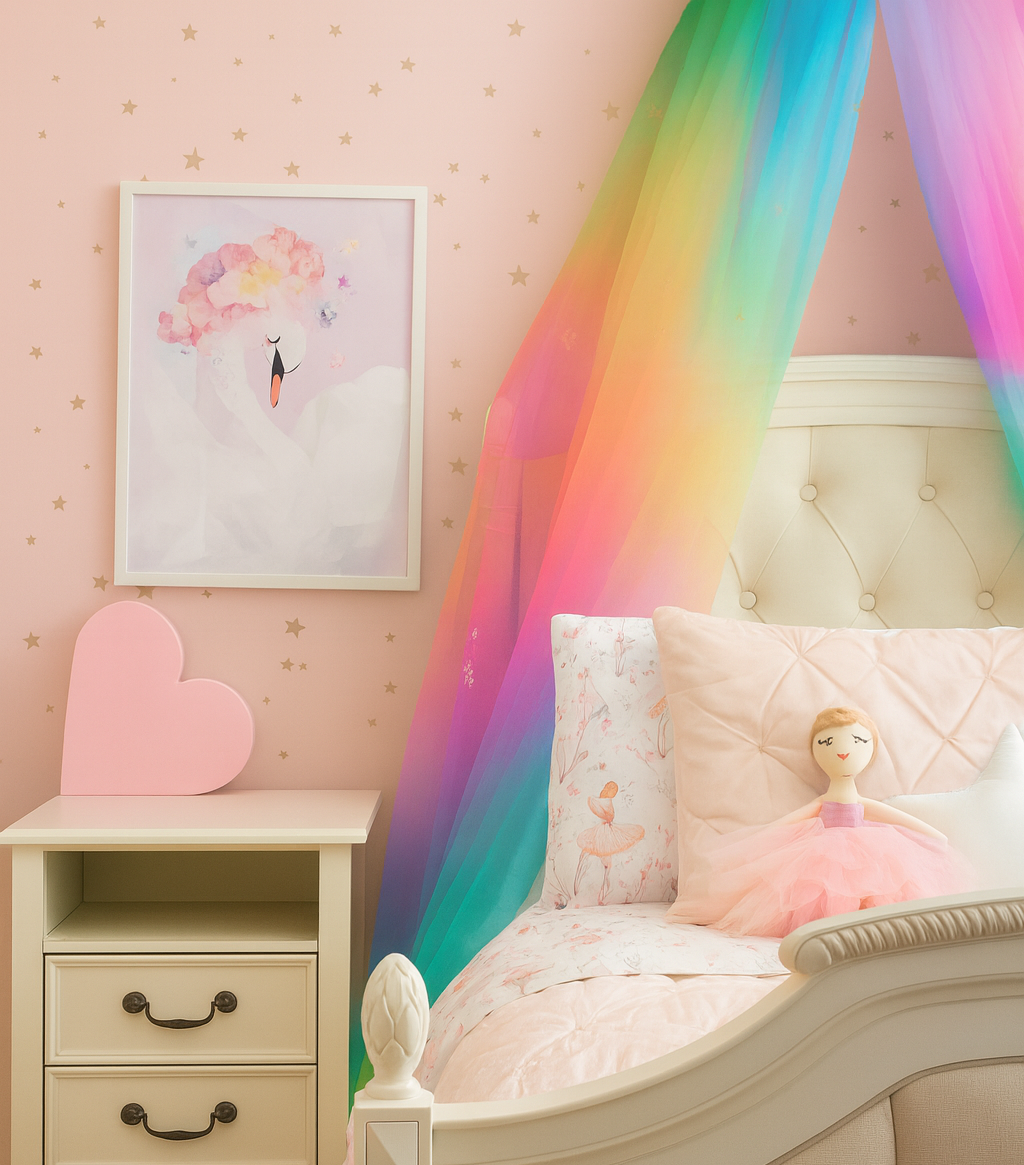 The sheer multi-coloured fabric is soft and flowing, adding a magical touch perfect for kids and younger teens who love bright, cheerful décor.